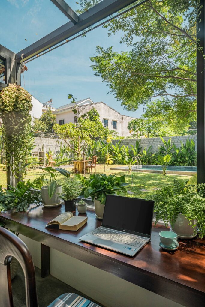 Remote workers and creatives will fall in love with our dedicated workspace. Set against floor-to-ceiling glass walls, youโ€™ll enjoy uninterrupted views of the garden and pool while you work, read, or journal.